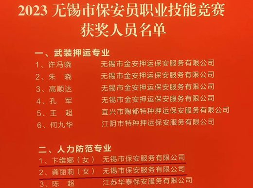 員工卞維娜在“無錫工匠杯·2023無錫市保安員職業(yè)技能競賽”人力防范組比賽中獲得第一名,榮獲“無錫市五一勞動獎?wù)?rdquo;,獲頒競賽獲獎證書。員工龔麗莉、王志強、駱春波分別獲得第二、第五、第六名,獲評“2023年度無錫市青年崗位能手”, 獲頒競賽獲獎證書。