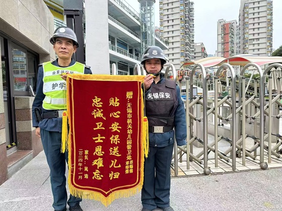 近日,我公司派駐機(jī)關(guān)幼兒園的保安員鄧文忠和范仁琪收到一面錦旗,錦旗內(nèi)容為:“貼心安保送兒歸,忠誠衛(wèi)士恩難忘”,隨著錦旗一起送來的,還有一封情真意切的感謝信,感謝兩位保安員第一時(shí)間發(fā)現(xiàn)孩子異常并主動(dòng)上前詢問具體情況,確認(rèn)孩子身份后隨即聯(lián)系老師并致電家長接回孩子。在接過這份“榮譽(yù)”后,兩位保安員紛紛表示收到錦旗是對我們工作給予的認(rèn)可,讓我們更有一種責(zé)任感和使命感要把這份工作做得更好,好讓孩子們的家長更放心。