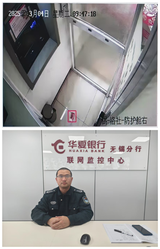 3月4日晚,駐華夏銀行無(wú)錫分行監(jiān)控中心保安員史建平在巡查視頻監(jiān)控畫面時(shí),敏銳地發(fā)現(xiàn)洛社支行防護(hù)艙內(nèi)有異常情況,他把監(jiān)控畫面放大,發(fā)現(xiàn)防護(hù)艙內(nèi)有客戶將部分現(xiàn)金遺落在地上。史建平同志立即啟動(dòng)突發(fā)事件應(yīng)急預(yù)案,使用遠(yuǎn)程控制按鈕,將艙門鎖閉,以防他人進(jìn)出。同時(shí),第一時(shí)間通知支行工作人員取走現(xiàn)金,妥善保管等待客戶認(rèn)領(lǐng)。