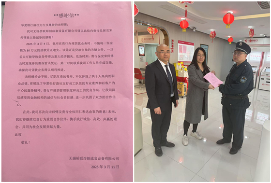 “感謝保安大哥拾金不昧!” 3月11日在華夏銀行無(wú)錫分行洛社支行的大廳里,客戶送來(lái)感謝信,對(duì)保安員宋曉明表示感謝。